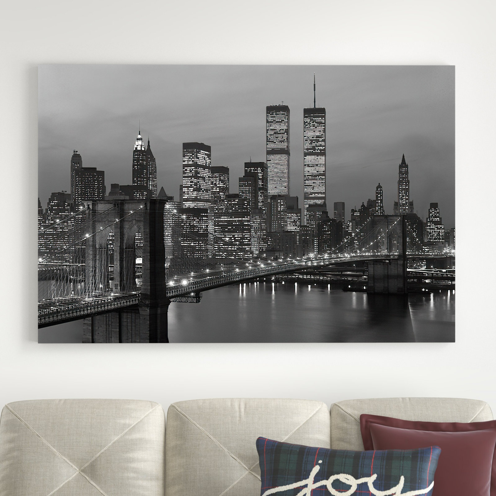 Vintage-inspired noir. This photo print sends you back multiple decades to the Big Apple, showcasing a 1980s night skyline of Manhattan with the World Trade Center in the background and the Brooklyn B…. Read More.