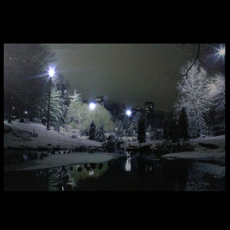 - Depicts a nighttime winter scene in a city park and an ice filled pond with ducks with the city skyline in the background