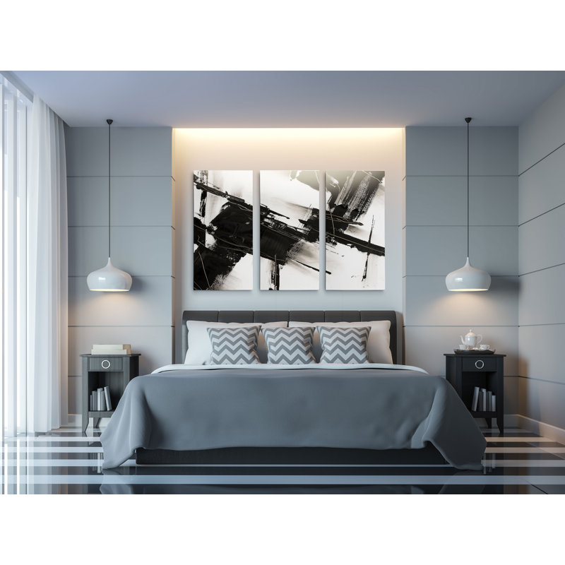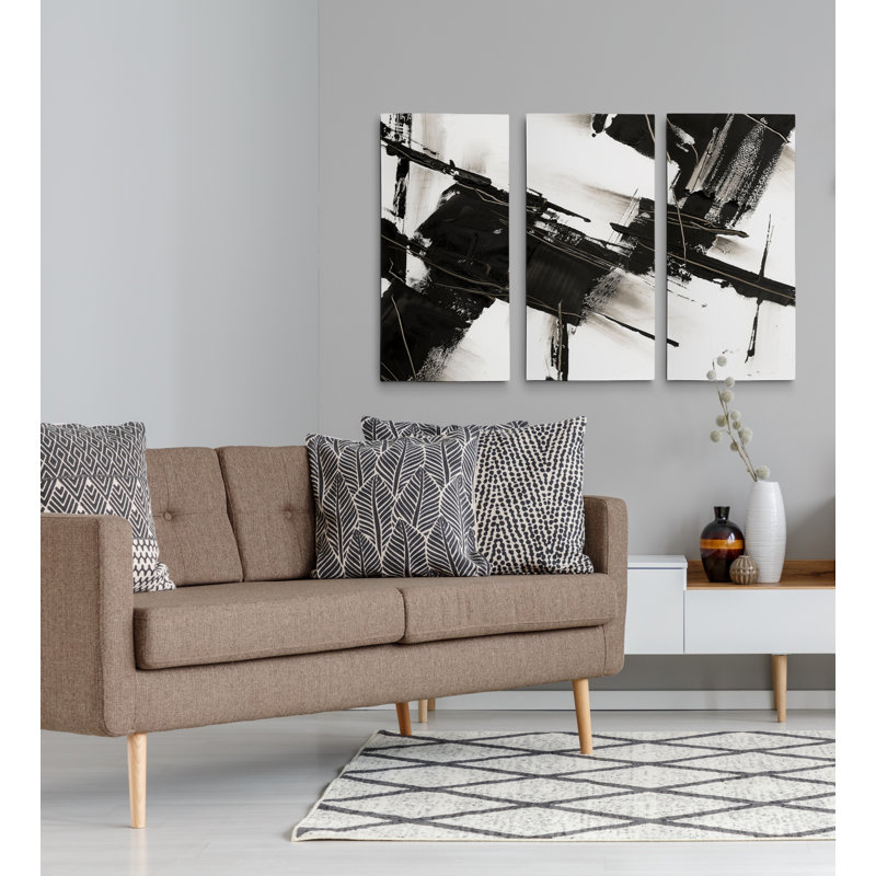 Bring a touch of abstract style to any space with this 3-piece print set, entitled Diagonal Matrix I, this distinctive set is made in the USA. It’s digitally printed on canvas and stretched over frames. This set features three rectangular sections of a painting featuring thick, abstract brushstrokes, rendered in shades of black and white on a white background, offering a heightened contrast. The pieces in this set can be hung separately or together for the full effect, and the included wall mounting hardware makes them easy to hang vertically over your sofa, bed, or dining room table.