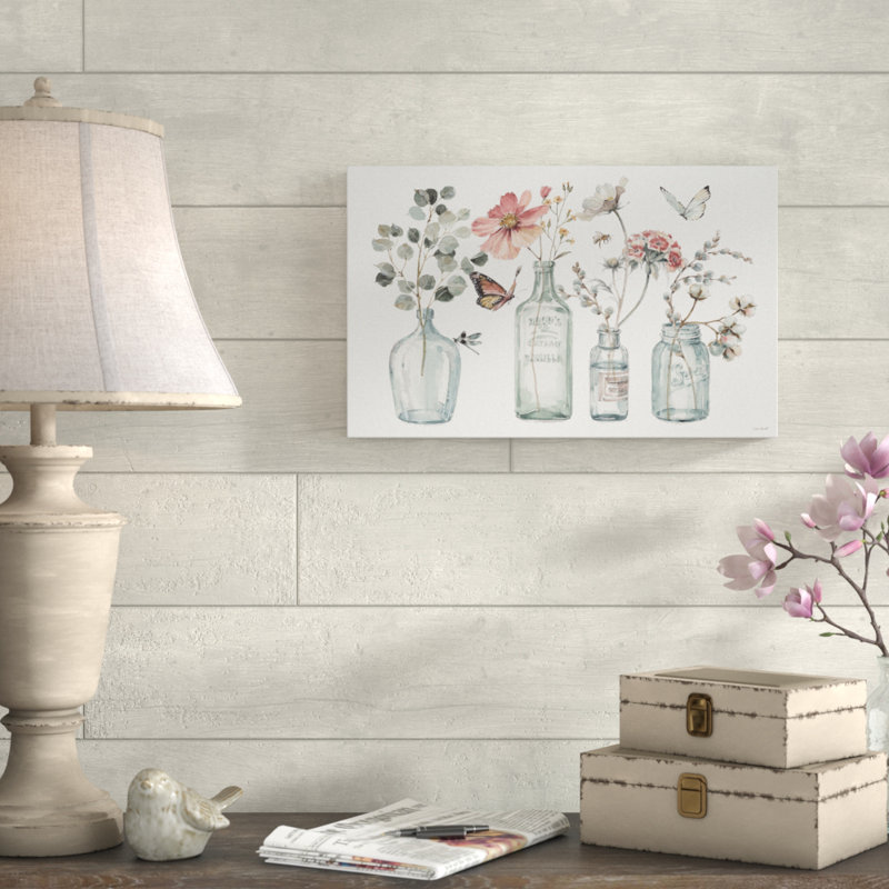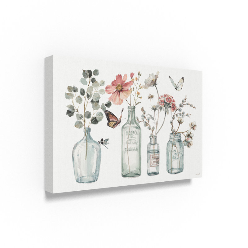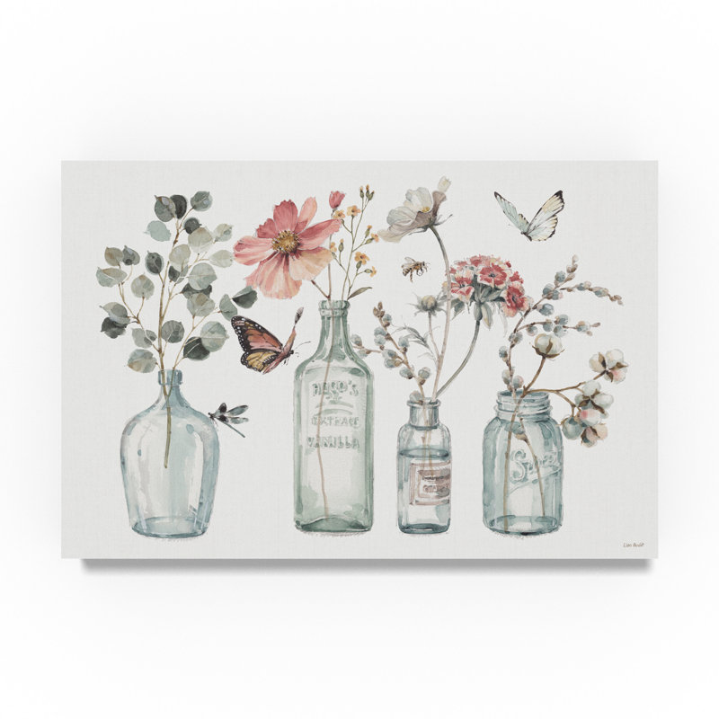 - This ready to hang, gallery-wrapped art piece features an arrangement of glass jars holding flowers