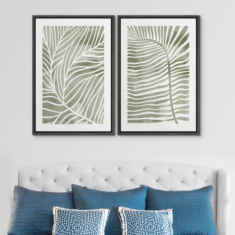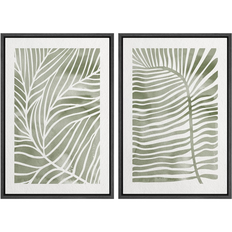 Abstract Botanical Sage Green Tropical Abstract Palm Tree Leaves Modern Art Simple Framed Canvas 2 Piece Print Wall Art