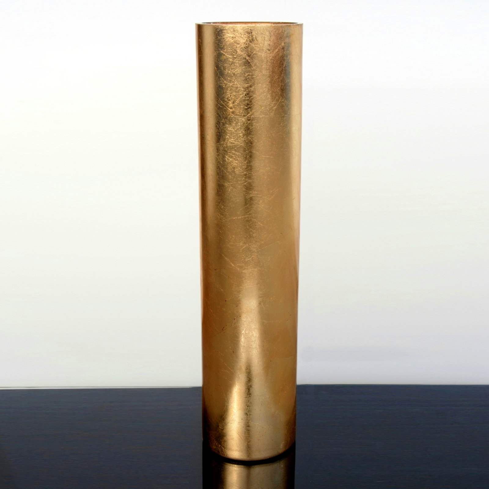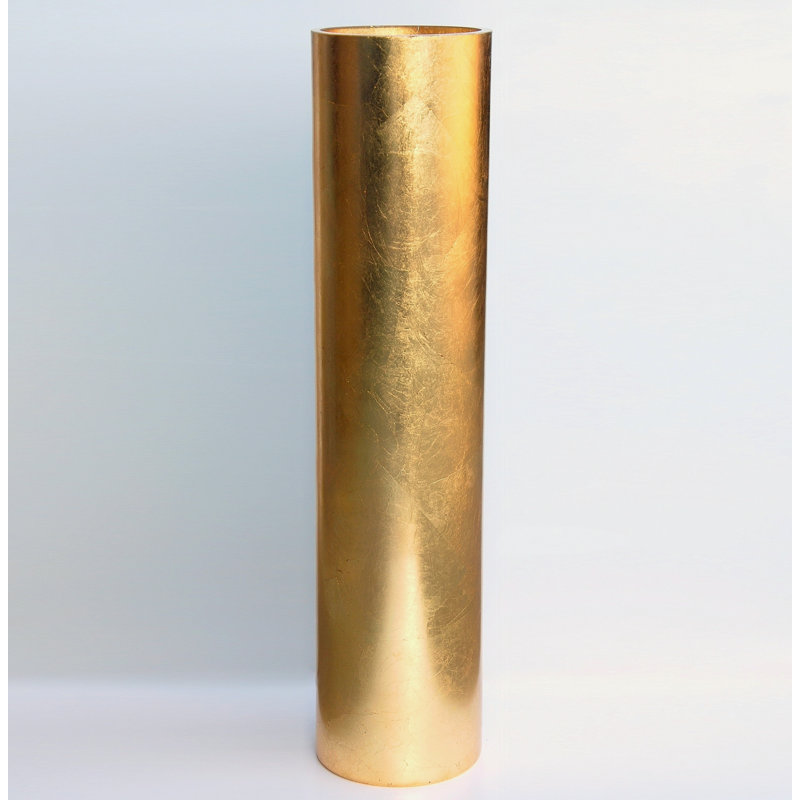 27″ high large mouth-blown cylinder vase hand gilded using gold leaves. Gold leaf details enhance the simple but sleek and contemporary look. The Glass vase is imported from Europe and hand-finished i…. Read More.