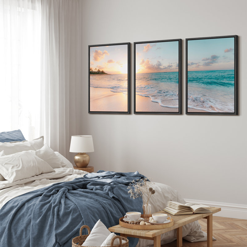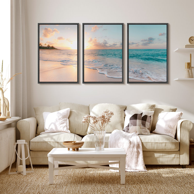 Aesthetic Sunset on Teal Ocean Coastal Beach Shore Framed Canvas 3 Pieces Print Triptych Wall Art