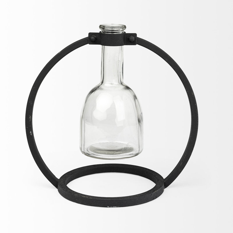 A unique decor piece, this Black Metal and Glass Vase will instantly add a unique design touch to any space in your home. This piece features a black metal stand that has a hollow circular base with circular rods rising up from either side and attached in the middle with a bracket. Hanging from the bracket there is a round flat-bottomed glass bottle which has a long narrow neck. This vase will give a modern industrial charm to the look of any live flowers, dried arrangements, or artificial fauna you choose to display in it. 8-inch H x 5-inch W x 9-inch D