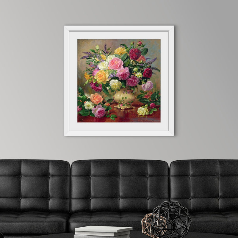 Add a touch of traditional color to your walls. This wall art embodies the vivid hues and classic style of antiqued still-lifes and updates it with a modern vibe. It depicts an ornate vase filled to bursting with blooming roses, peonies, and sprigs of lavender, all in vibrant pinks, yellows, and green hues. Originally by artist Albert Williams, this reproduction is printed with UV- and fade-resistant archival inks on artist-quality canvas, and it comes in a range of framing options for a gallery-worthy look. Bonus: It arrives with a wall hook for easy installation in your home.