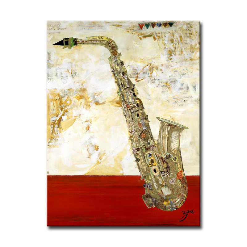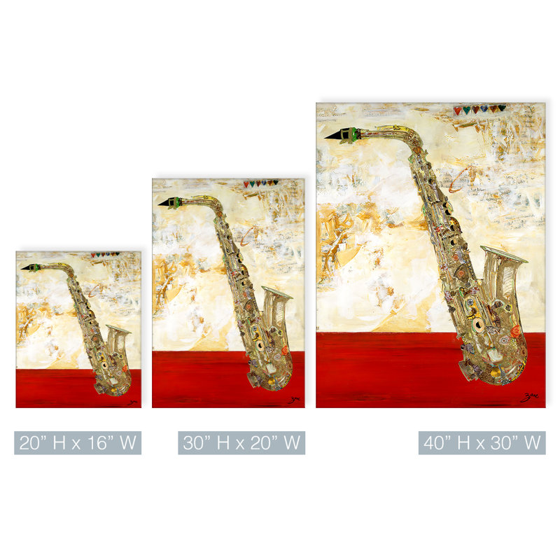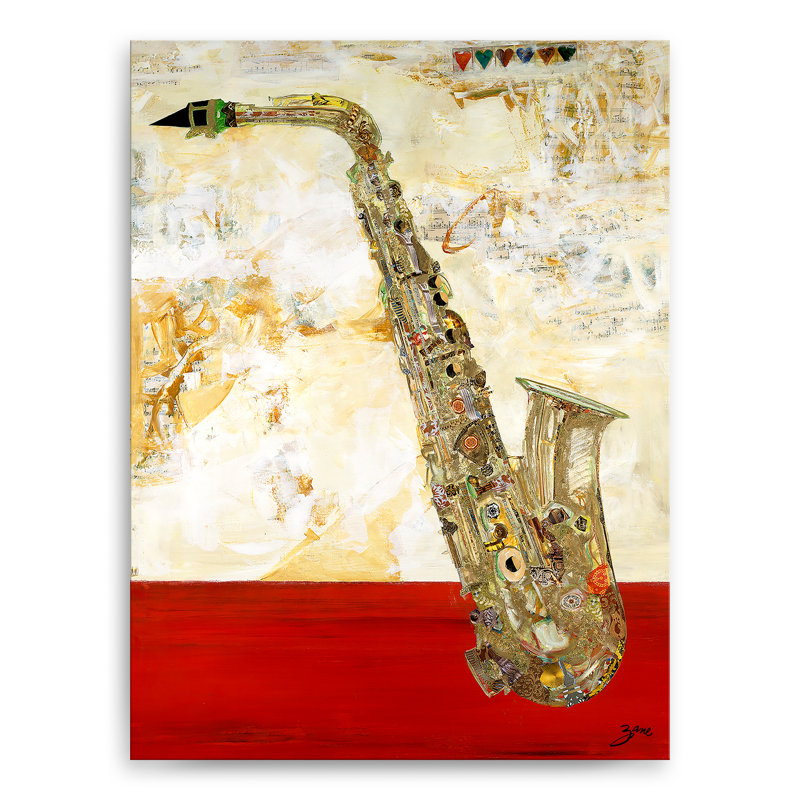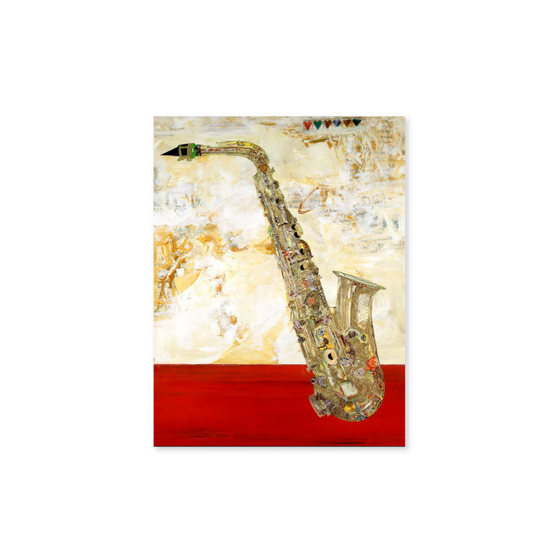 Jazz up your walls with this classic painting print. Reproduced from an original work, it features a detailed saxophone hovering front and center. The background consists of abstract gold-toned brushstrokes with lines of sheet music fading away into the swirls. And a vivid red block sits at the bottom for an eye-catching bit of bold contrast. This acrylic painting is printed on a rectangular canvas and wrapped around a kiln-dried wooden frame for a look that rivals any gallery. Plus, a wall hook is affixed to the back for hassle-free hanging right out of the box.