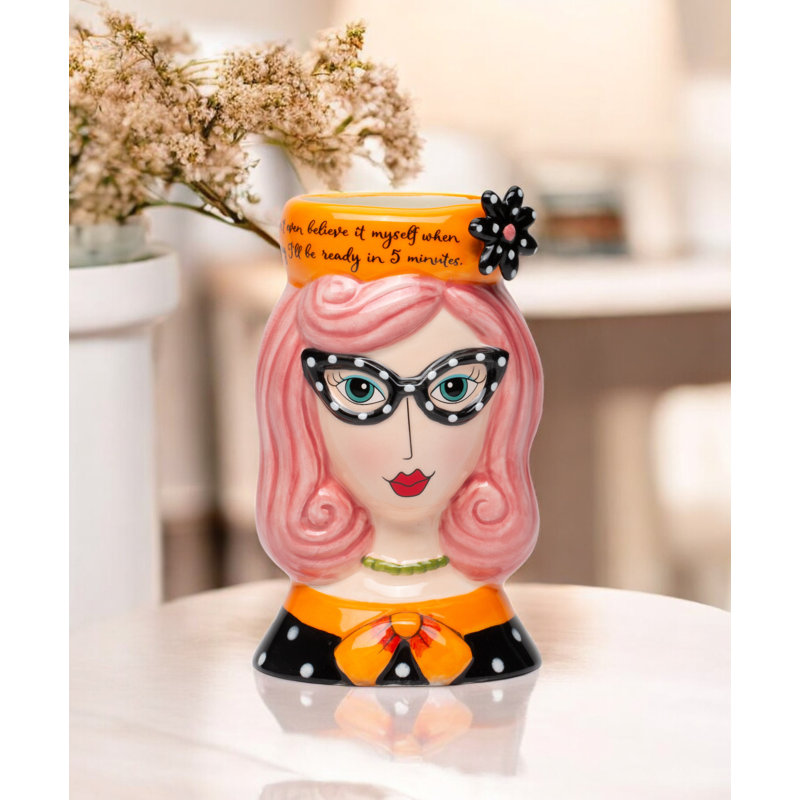Dollymama’s by Joey Heiberg. The new creation of flower container or vase or makeup brush holder or toothbrush holder. Hand-painted by the skilled worker. Each lady has its own hair style. Unique sculpted the lady vase with her own personality. Pink hair lady holder. Message on the vase means I don’t even believe it myself when I say I’ll be ready in 5 minutes.