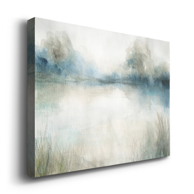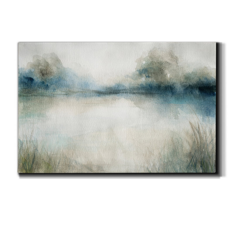 Titled Still Evening Waters I, this wrapped canvas print adds a calm, relaxing vibe to your space. Featuring a serene blue and gray lake scene, this painting is printed on canvas inside a solid wood f…. Read More.