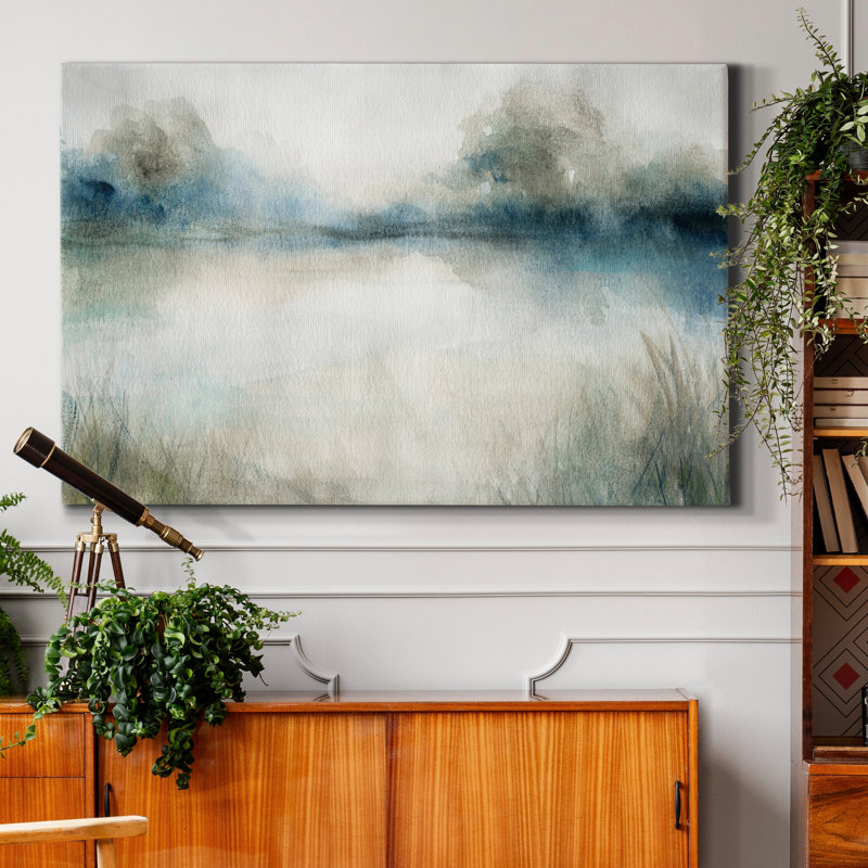 Titled Still Evening Waters I, this wrapped canvas print adds a calm, relaxing vibe to your space. Featuring a serene blue and gray lake scene, this painting is printed on canvas inside a solid wood frame for a clean, versatile look we love. It features a beveled wood stretcher bar and a premium hand-stretched design that’s made to last. This painting is offered in an array of different size options, so you can get just the right look in an array of different spaces. Best of all, hanging hardware is included, so you can add it to your space as soon as it arrives.