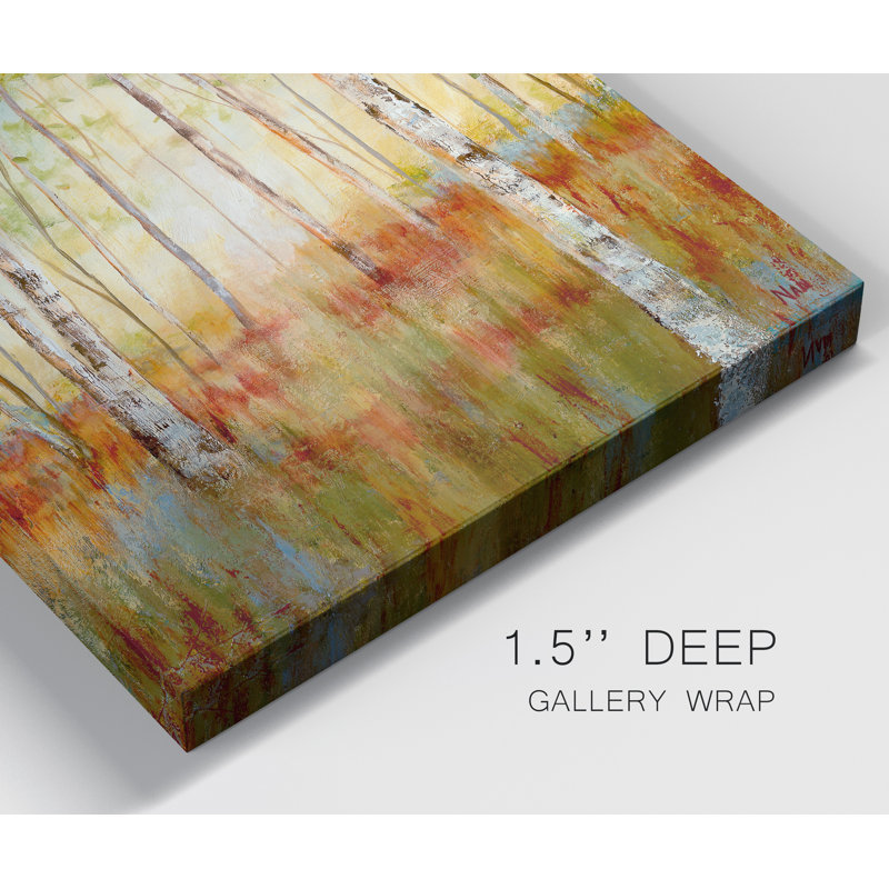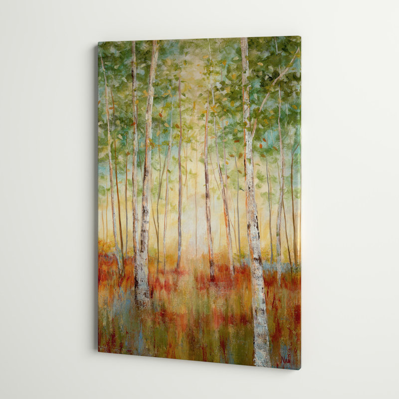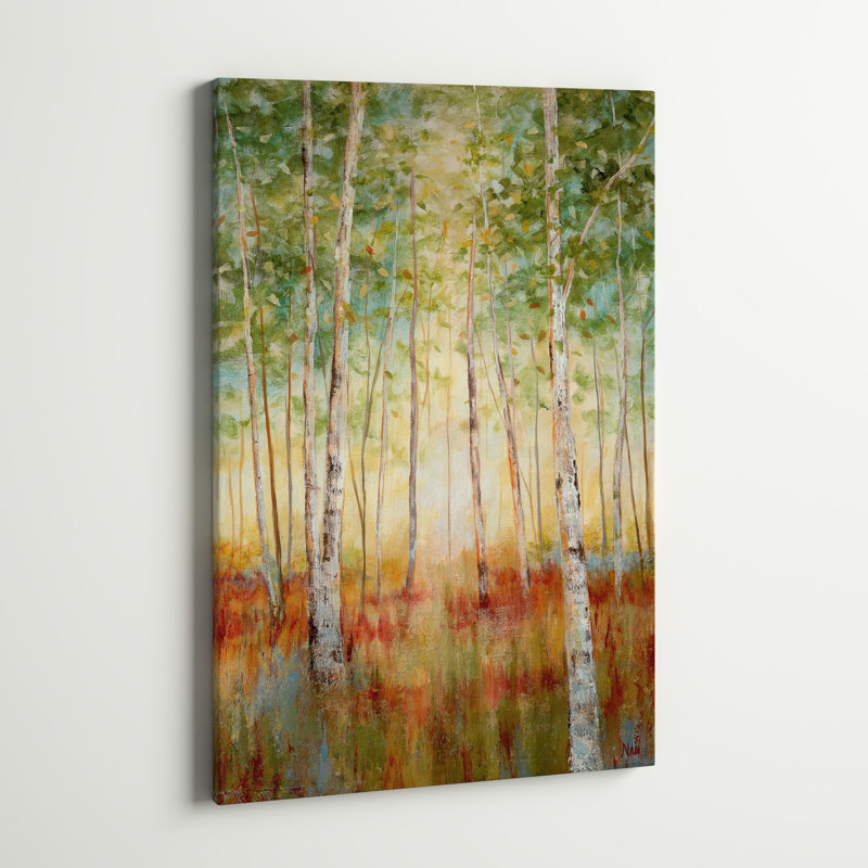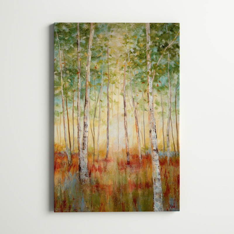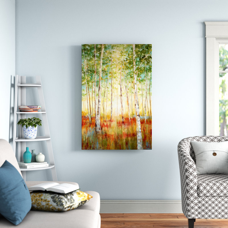 Infuse your living space with a serene, relaxed vibe with this painting print on wrapped canvas. Reproduced from an original work by artist J. Paul, “Birch Woods” depicts a peaceful wooded landscape o…. Read More.