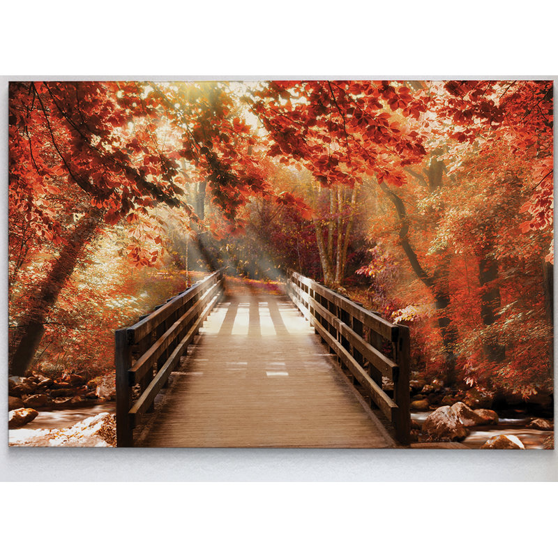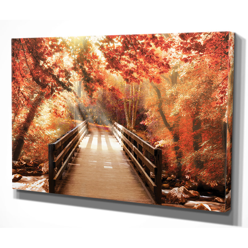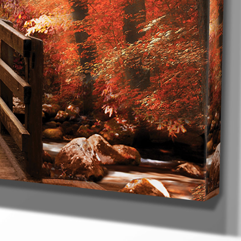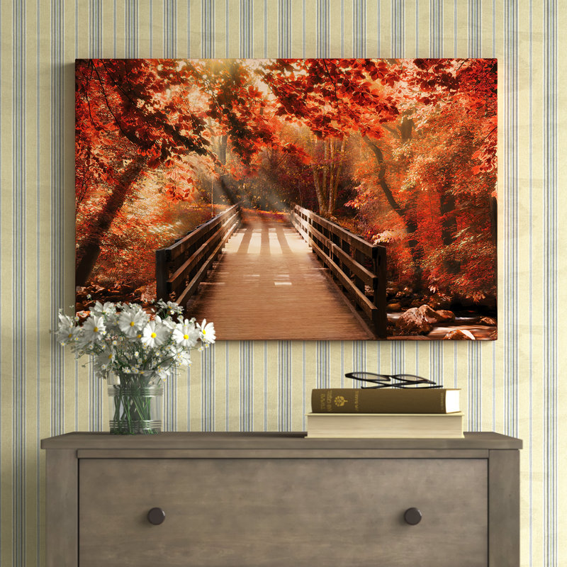 Refresh any room in your home with this vibrant photographic print, featuring an autumn-inspired focal point that friends and family will fall for. This recreation of the artwork titled, “Autumn Bridge” is printed on giclee canvas in hues of red and brown for a warm look. This rectangular design with a horizontal orientation showcases the image of a wooden bridge over a creek, and it’s surrounded by trees changing colors and beams of light subtly filtering through. Plus, this print arrives with wall-hanging hardware, allowing you to place it on any wall in your living room or entryway.