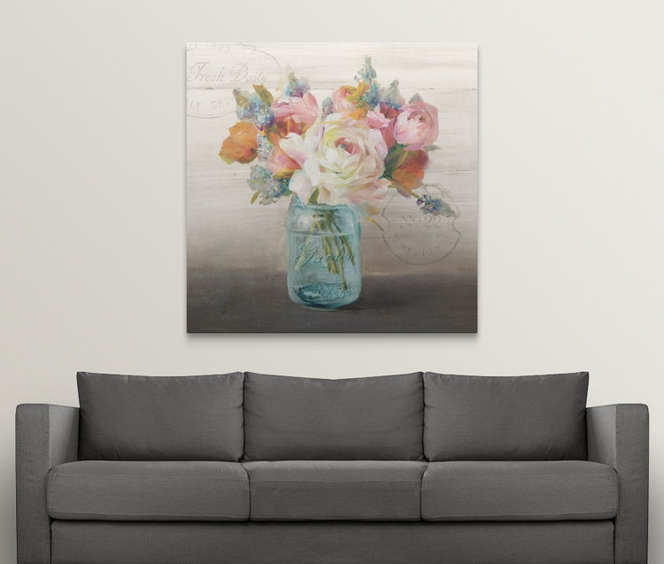 Contemporary artwork of a bouquet of roses and peonies in a glass mason jar….. Read More.