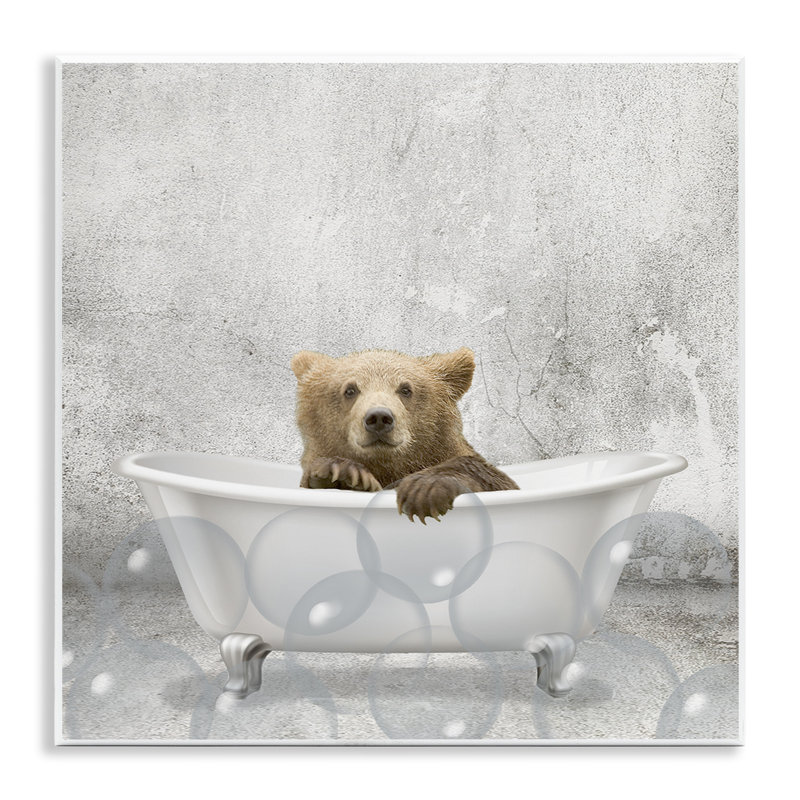 Un-bear-ably cute. This giclee print lends a whimsical feel to your bathroom or any other room thanks to its depiction of a baby bear sitting in a claw-foot bathtub and staring directly at us. A collection of bubbles is floating in front, while the entire background looks like stone for a rustic touch we love. This graphic art is printed on a flat square surface of your choice using high-quality inks and comes ready to hang right when it arrives.