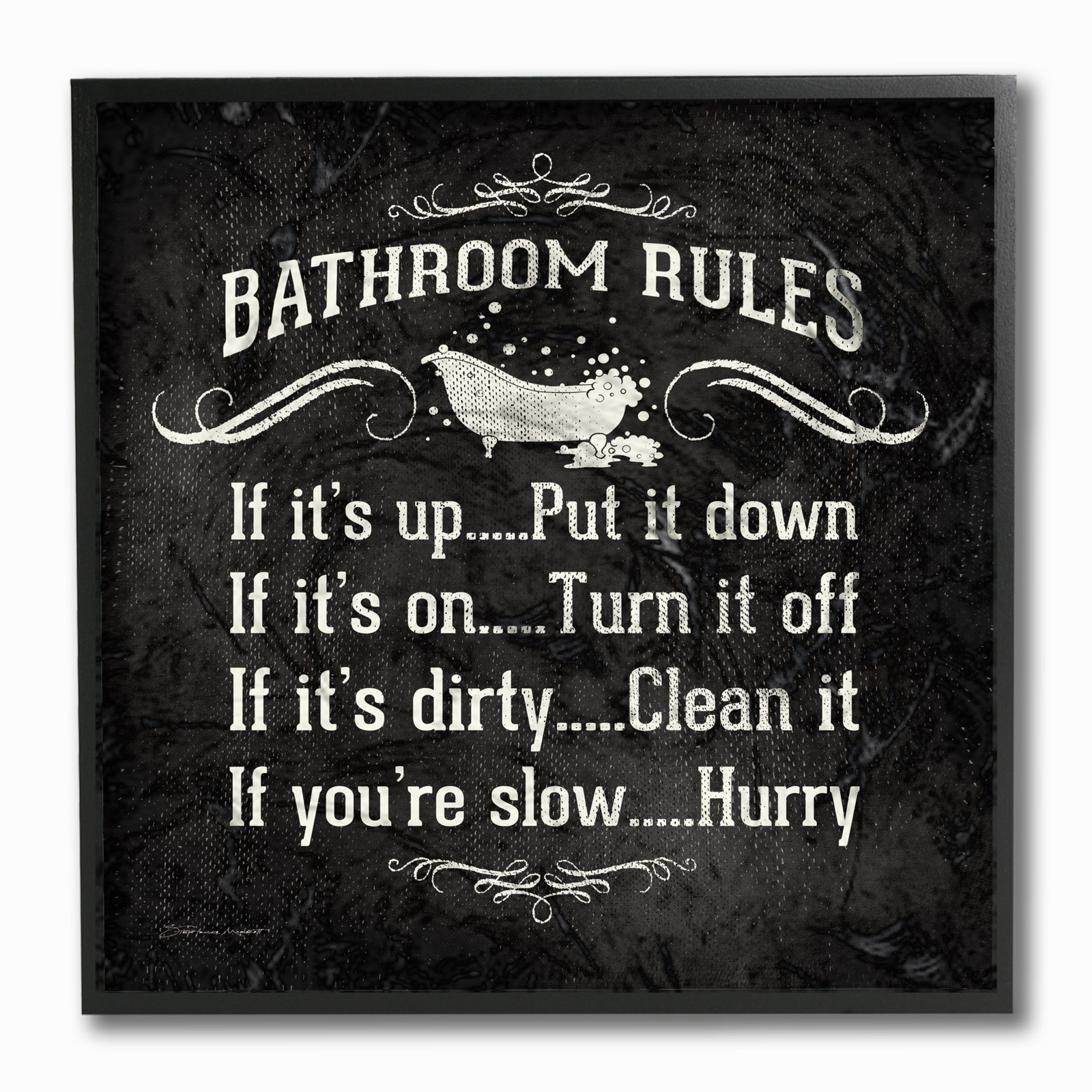 Lay down the rules of the restroom for all who enter with this tongue-in-cheek textual art on canvas. “If it’s up¦ put it down,” the list begins, “if it’s on¦ turn it off.” The lettering pops over a distressed black background, while a bubble bath graphic and scrollwork detail round out the sing. Made in the USA, this quirky image is printed using high-quality inks on canvas, then hand-cut and stretched over a wooden frame. Measuring 17″ H x 17″ W x 1.5″ D, this piece arrives ready to hang right out of the box with wall-mounting hardware included.