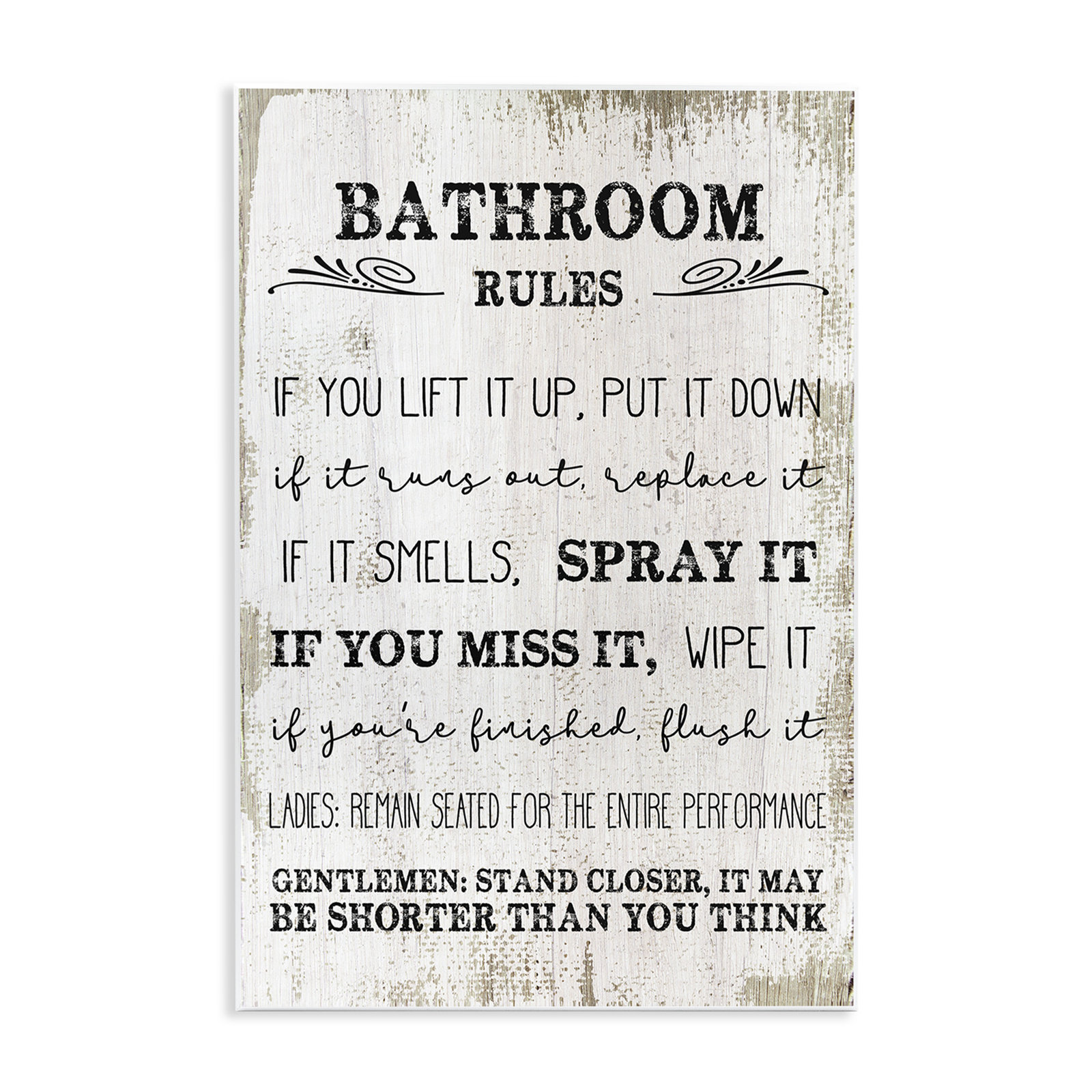 Bathroom Rules Funny Word Wood Textured Design’ Graphic Art on Canvas