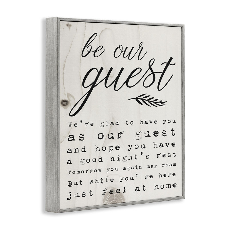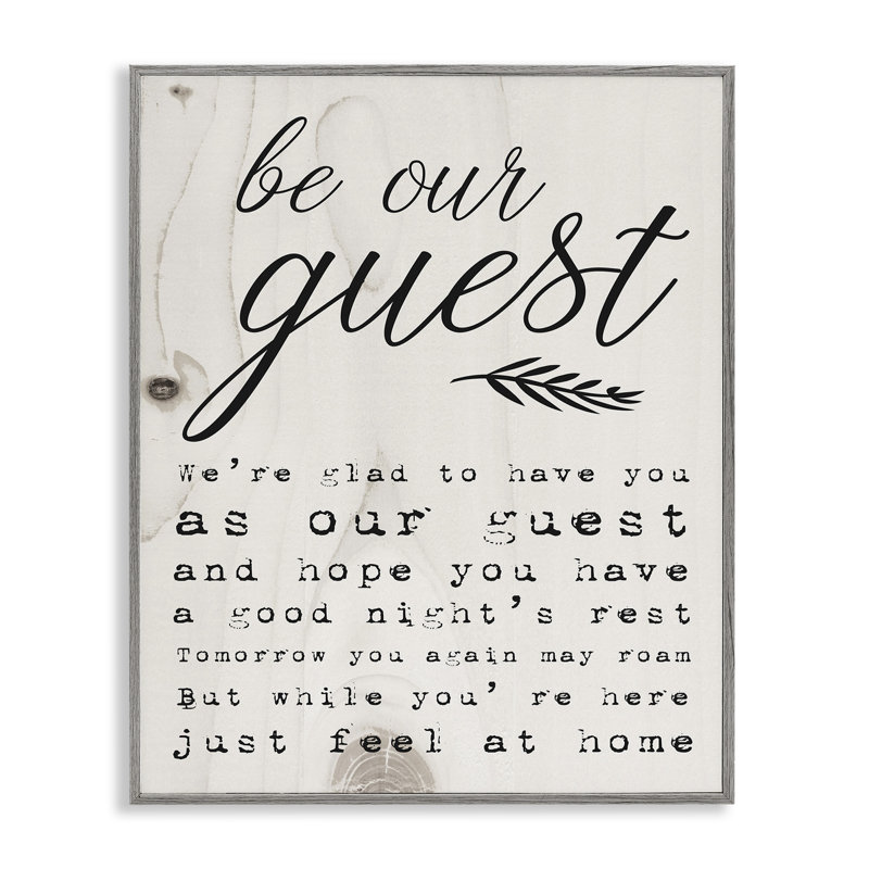 Gearing up for weekend guests? Make visitors feel right at home by hanging up this welcoming textual art print. Proudly made in the USA, this piece showcases a heartfelt message beginning with “Be our guest” in scrolling font with a feather motif just below. Neutral ivory and black hues outfit this design, giving it the versatility to complement any color palette you pick. Wall-mounting hardware is included, so this print is ready to hang right away.