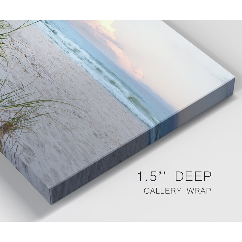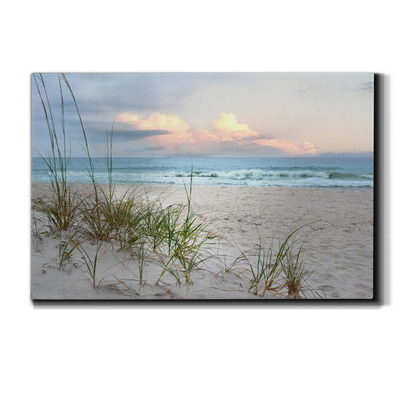 Bring a touch of serene style to your space with this distinctive giclee print. Entitled “Beach Driftwood,” this rectangular photograph is printed on cotton canvas and hand-stretched over a solid wood frame. It depicts a beach landscape with seagrass, sand, and rolling waves, in shades of beige, blue, green, and white. It includes mounting hardware, so it’s easy to hang horizontally. This piece creates a focal point over a sofa, bed, or dining room table in your coastal home.