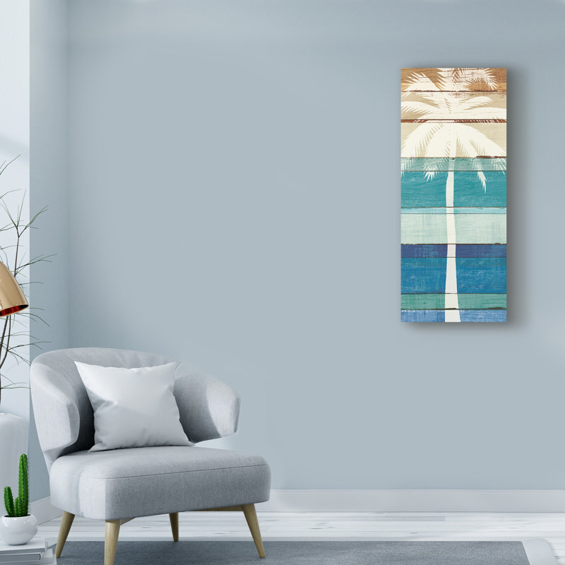 Get ready for the tropics with this graphic art print, and paint your walls with a breezy coastal vibe. Designed by Michael Mullin, it features the silhouette of a palm tree in white with horizontal slabs of blue, green, and brown to depict the sea and the sky at sunset. The colorful pattern and the fading of the hues make the surface resemble distressed wood for a lived-in, vintage-inspired look. It’s printed on wrapped canvas in a variety of sizes to suit your space. A single hook is affixed to the back for hassle-free hanging.