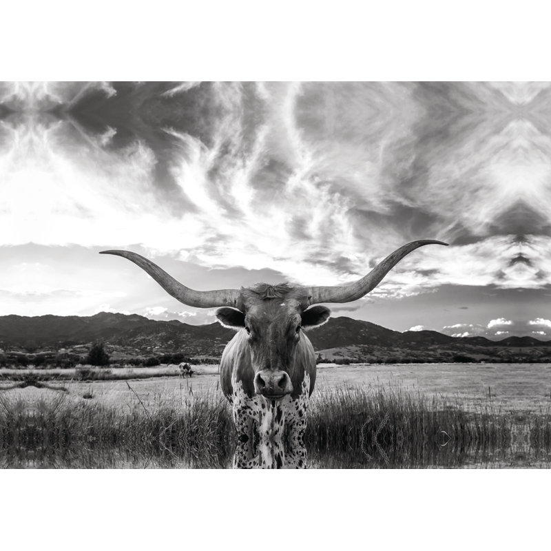This canvas print features a traditional black-and-white outdoor portrait of a longhorn cow staring directly at the camera. With a stunning natural landscape in the background, this photograph brings a rustic look to your space. It’s printed in the USA using UV- and fade-resistant archival inks, so you’re able to hang it up anywhere in your home, even in direct sunlight. This print is also wrapped in canvas with a matboard backing. Mounting hardware is included, making hanging up a breeze.