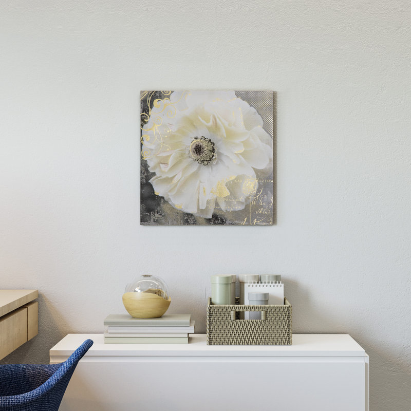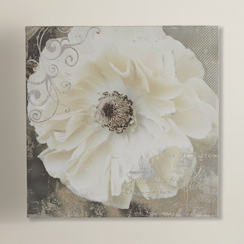 Who says garden glory has to be limited to your blooms out back? Bring a bit of blossoming allure into your abode – without any of the pesky upkeep – with this eye-catching canvas print. Showcasing a full-on flower with distressed details adorning each corner, it offers neutral hues of beige and gray. This piece is printed on canvas, then wrapped around a clean-lined frame that measures 20″ square. Plus, it arrives ready to hang with wall-mounting hardware already installed on the back.
