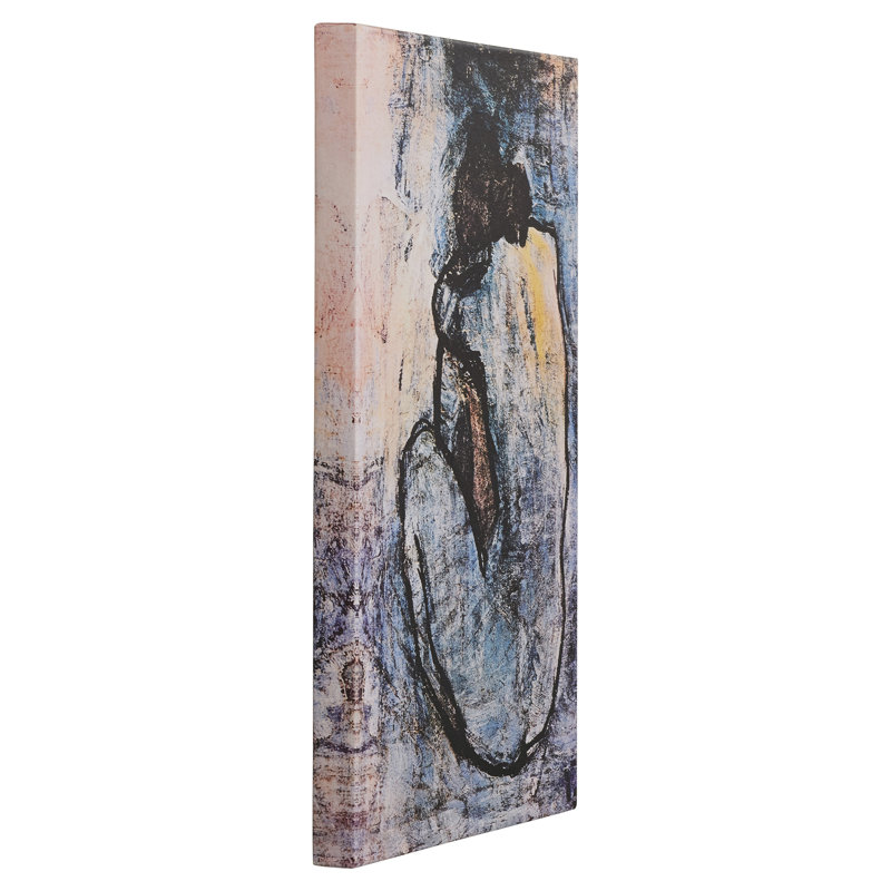 Bring classic modern style to your living room, bedroom, or home office with this distinctive wrapped canvas painting. A reproduction of “Blue Nude” by celebrated artist Pablo Picasso, this rectangular oil painting depicts the back of a seated nude figure, rendered in shades of blue, black, and beige. This piece is made in the USA and printed on 100% cotton canvas; it comes with wall mounting hardware, so it’s easy to hang vertically over your couch, bed, or desk.