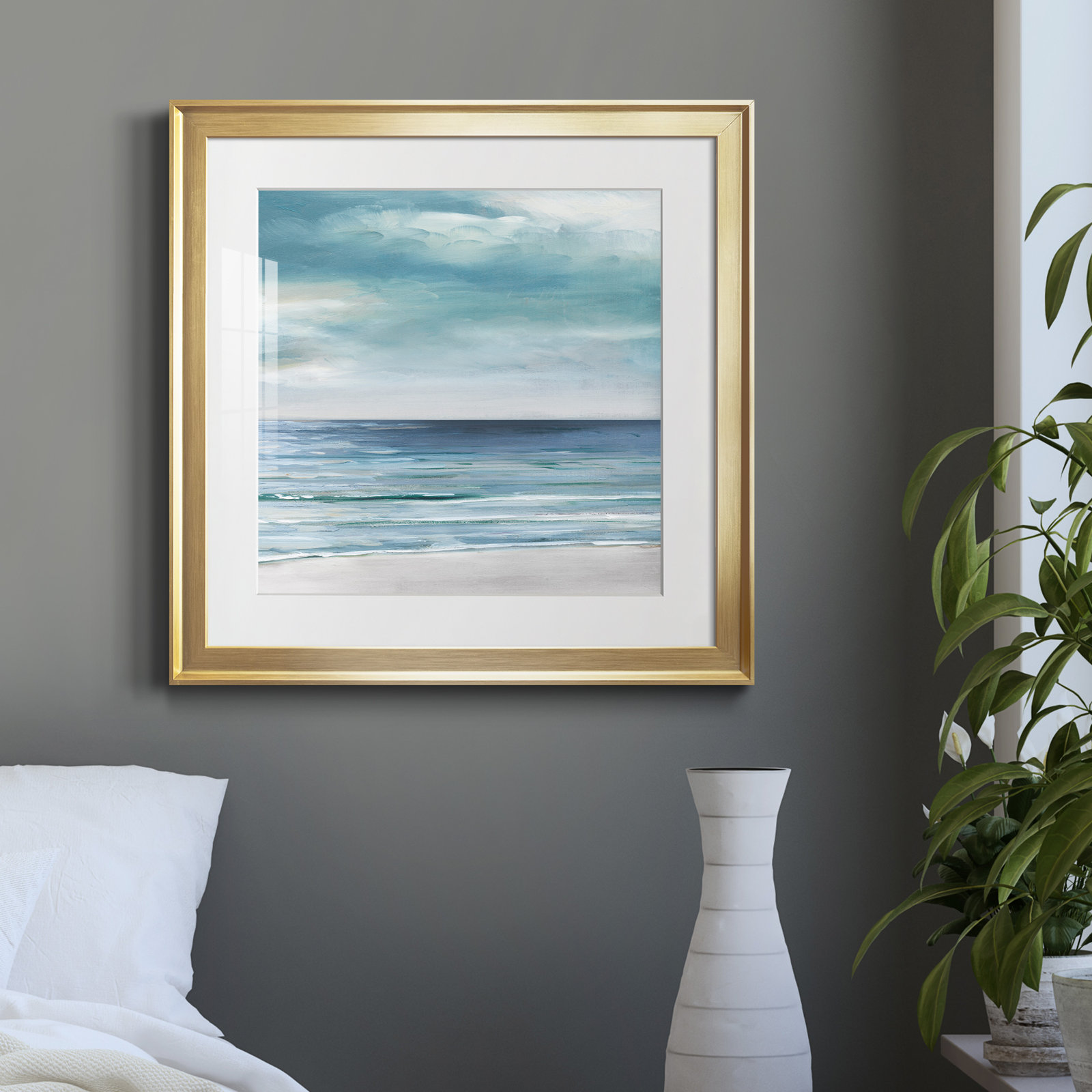 This painting print lends a simple coastal accent to any room in your home. Reproduced from an original work by J Paul, it features a classic shot of the horizon with calm waves washing along the sandy beach, while the fair skies rise above. Pleasant silver, blue, and green tones stand out the most, and an acrylic protector helps keep dust from coming into contact with the image. This watercolor painting is printed on paper and placed on a white mat and picture frame. Plus, a wall hook is affixed to the back for hassle-free hanging right when it arrives.
