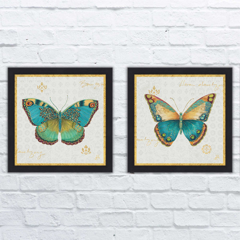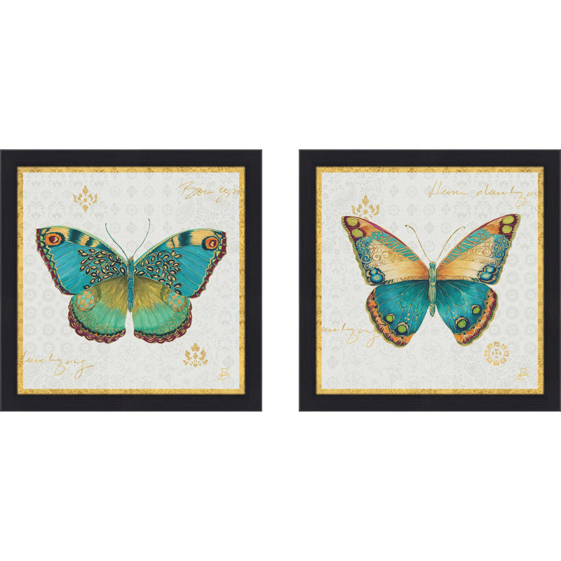 Splash bohemian charm across your walls with this two-piece framed acrylic painting print set. Each picture showcases a gorgeously colored butterfly with beautifully patterned wings over a gray and gold French print backdrop. Made in Canada, each artful image is printed on high-quality paper, set under protective glass, and framed in clean-lined polystyrene moldings in a brushed black finish. Fully assembled right out of the box, each square frame arrives ready to hang with your preferred mounting hardware (not included).