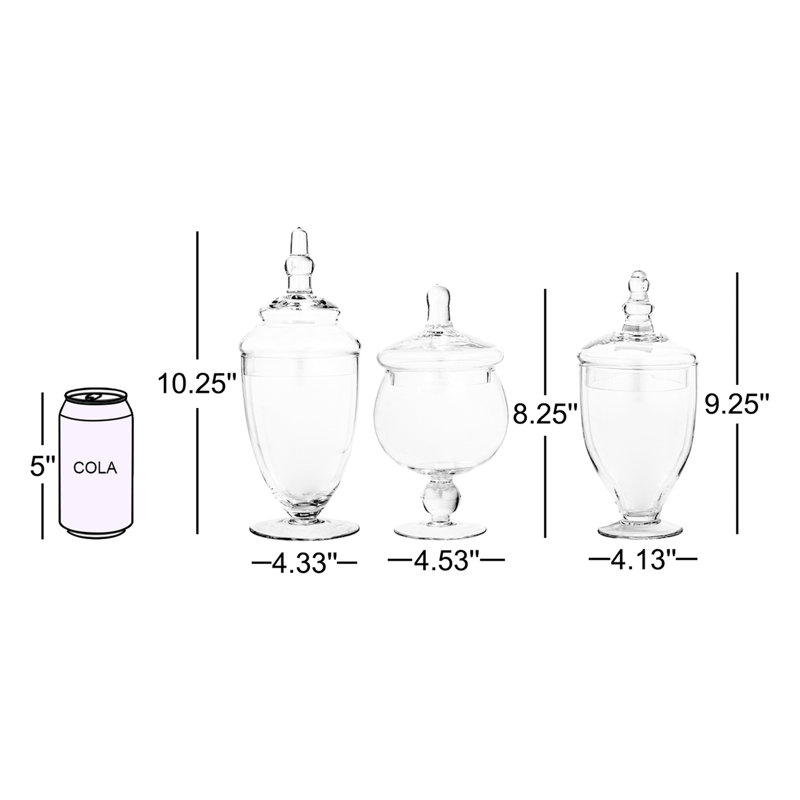 • Set of 3 Elegant Glass Apothecary Jars – Includes three uniquely shaped, clear glass jars with matching lids, offering decorative variety and functional storage for any room in your home. Ideal for bathrooms, kitchens, entryways, or event displays. Set includes: Three (3) Clear glass Apothecary Jars. Measuring: Taller jar is 10″ the two shorter ones are 8″ in height and 4.5″ in width.l Making them perfect for candy buffet display. Being a great home decor Accent by Filling with flowers shells and potpourri! Can be kept in a bathroom for holding anything from cotton balls to bath salts or soaps.