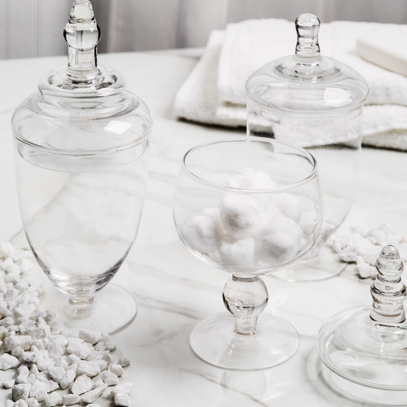 Perfect for organizing loose toiletries, storing dry goods, or showcasing colorful candies, this apothecary jar set of three brings both function and vintage charm to any space. Inspired by classic pharmacy glassware, these decorative glass storage jars feature a timeless silhouette that fits seamlessly into farmhouse, modern, rustic, and traditional home decor. Whether styled on a bathroom vanity, kitchen countertop, coffee bar, or open shelf, their clear glass design keeps your essentials visible, accessible, and beautifully displayed!