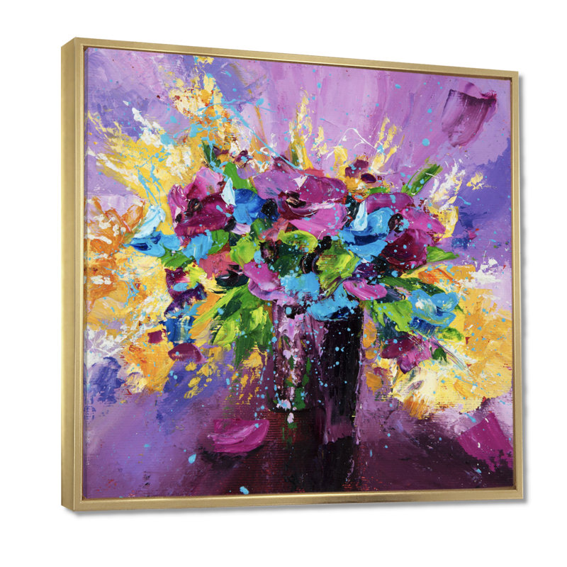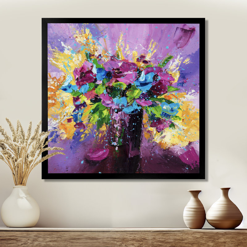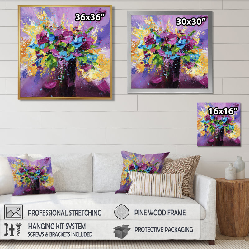 Enliven your space with this graphic art print’s vivid hues and floral composition. The design features a bouquet of flowers set in a vase, surrounded by an almost galactic purple background. It’s premium giclee-printed with high-quality inks on wrapped canvas, with a bold color palette that shows off purple, blue, and yellow blooms. We love that this dynamic wall art comes with mounting hardware, so it’s ready to hang right out of the box. Best of all, it comes with a range of frame options.