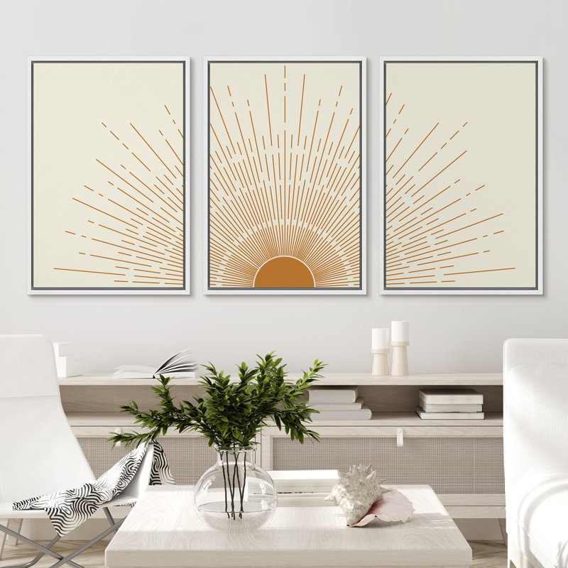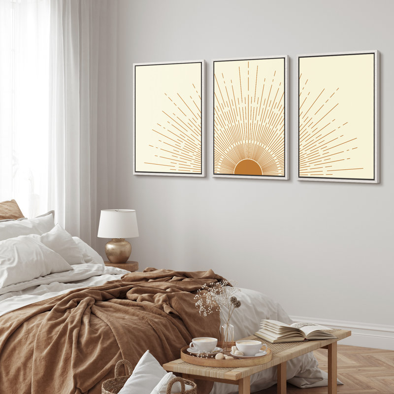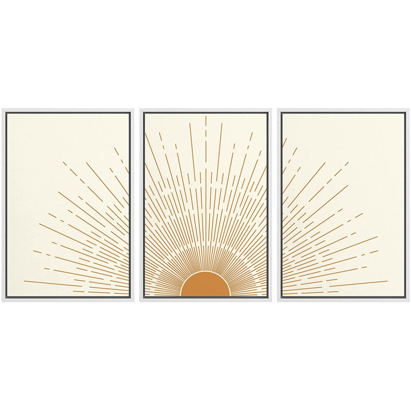Bright Mid-Century Modern Orange Minimal Sun ShineArt Boho Decor Framed Canvas 3 Pieces Print Set