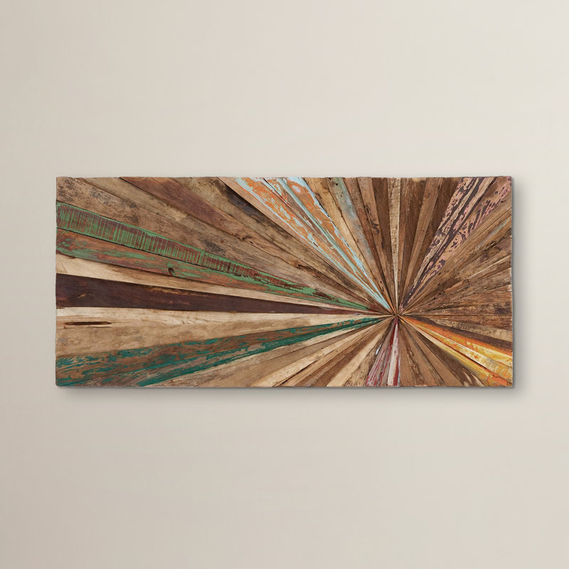 - This rustic style inspired teak wood abstract wall decor comes in a creative sunburst pattern design by arranging teak wood pieces cut in long triangles to form this stunning abstract art