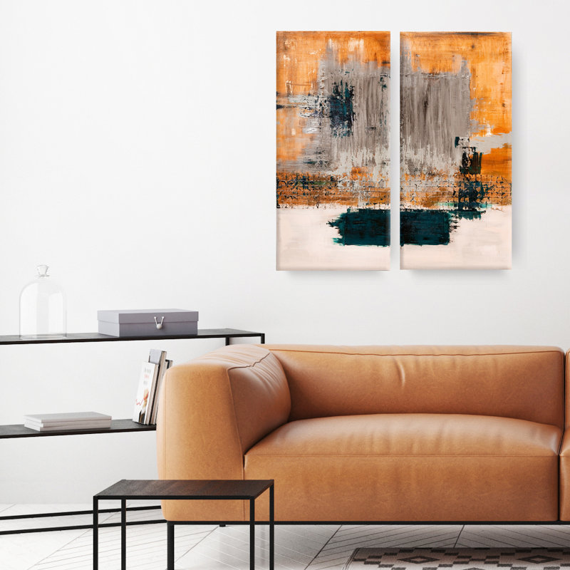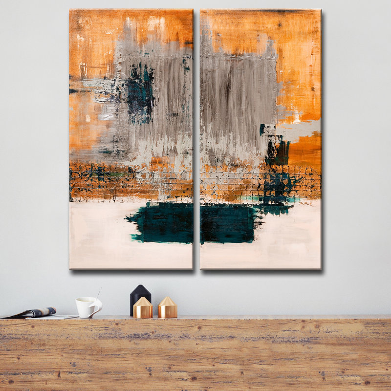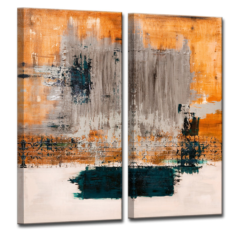 Add unique shapes and color palettes to your space. This oversized abstract canvas uses layering dimensions and strokes of color. It is fully finished, arriving ready to hang on the wall of your choice.