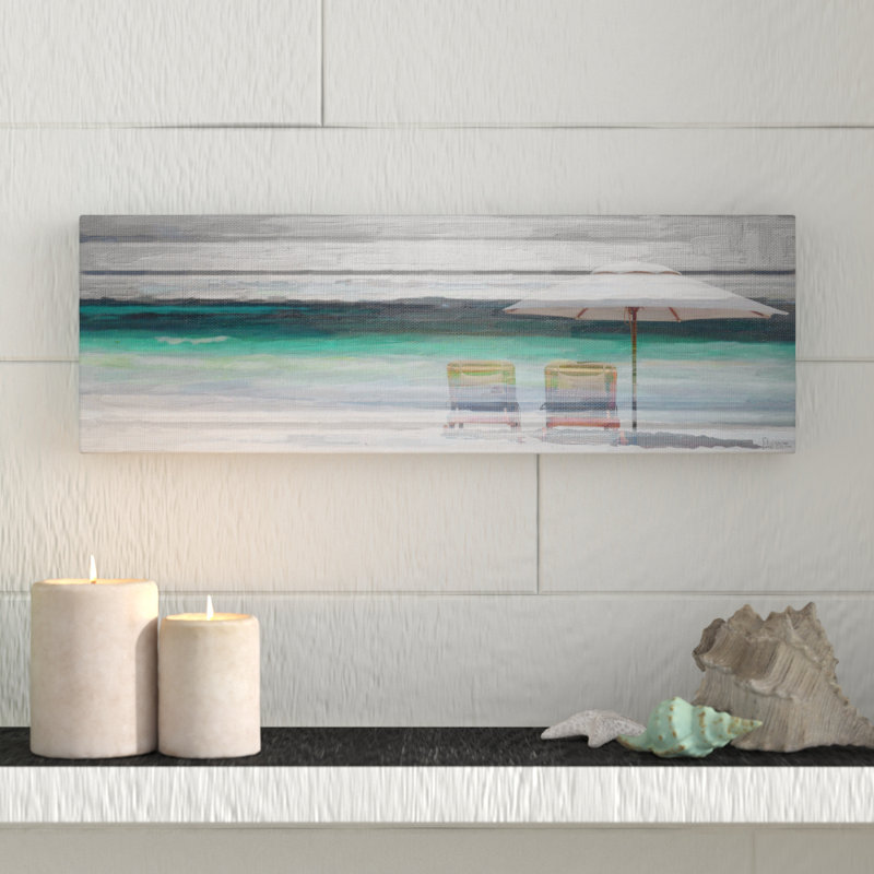 Maybe your dwelling isn’t right by the shore, but that doesn’t mean you can’t enjoy beach bliss from your abode! Bring a bit of shoreline style to any space with this peaceful painting print. A pair of vacant lounge chairs sit beneath an umbrella nestled in the sand for a serene scene, while a blue and gray ocean horizon in the background offers a subtle splash of color. Proudly printed in the USA, this wrapped canvas is complete with wall-mounting hardware to make the hanging process a breeze.