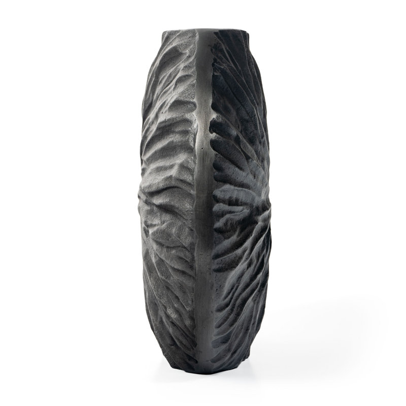 This solid cast aluminum, round metal vase is all about texture and style. The organic look of the textured surface creates dimension and intrigue. Beautiful on its own or pair it with its coordinating counterparts for an elevated approach to your decor. Each vase is sold separately.
