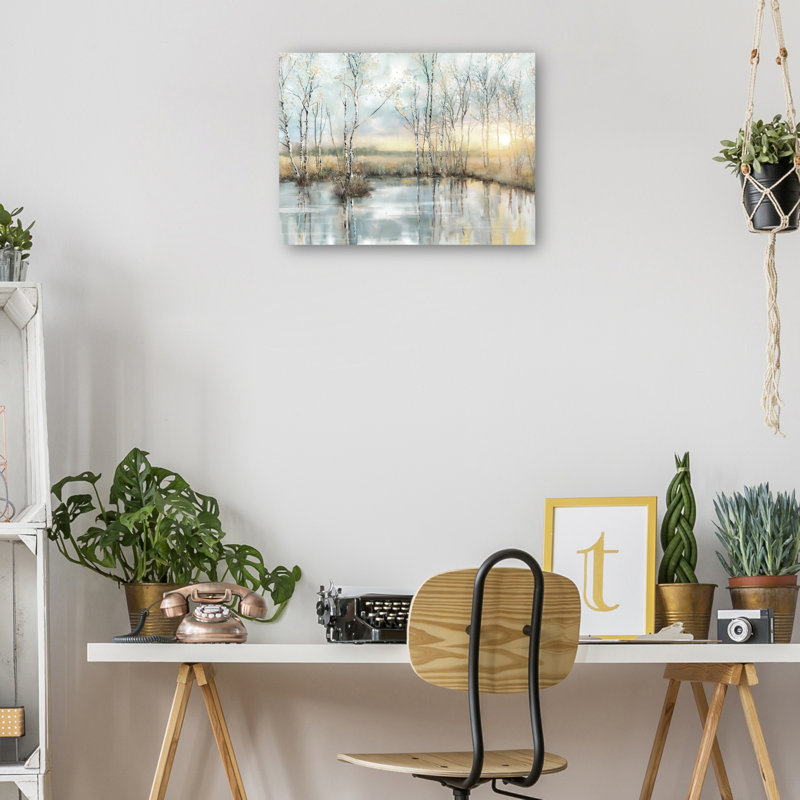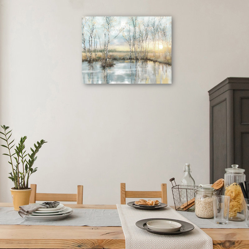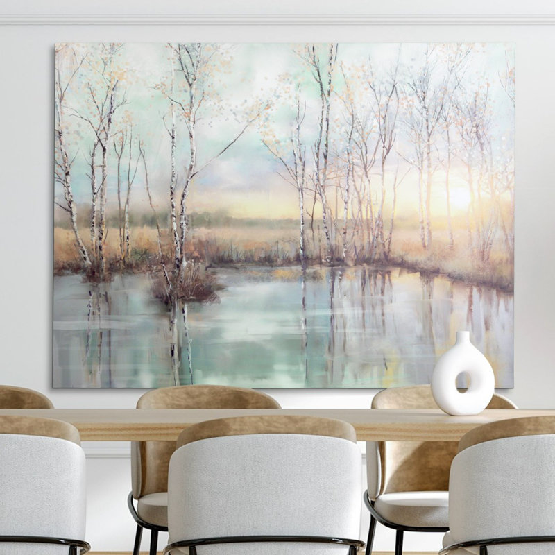 Create a serene focal point in your home with Calm Reflections by Studio Arts. This tranquil canvas art print features a watercolor-inspired landscape of slender birch trees mirrored in still water, w…. Read More.