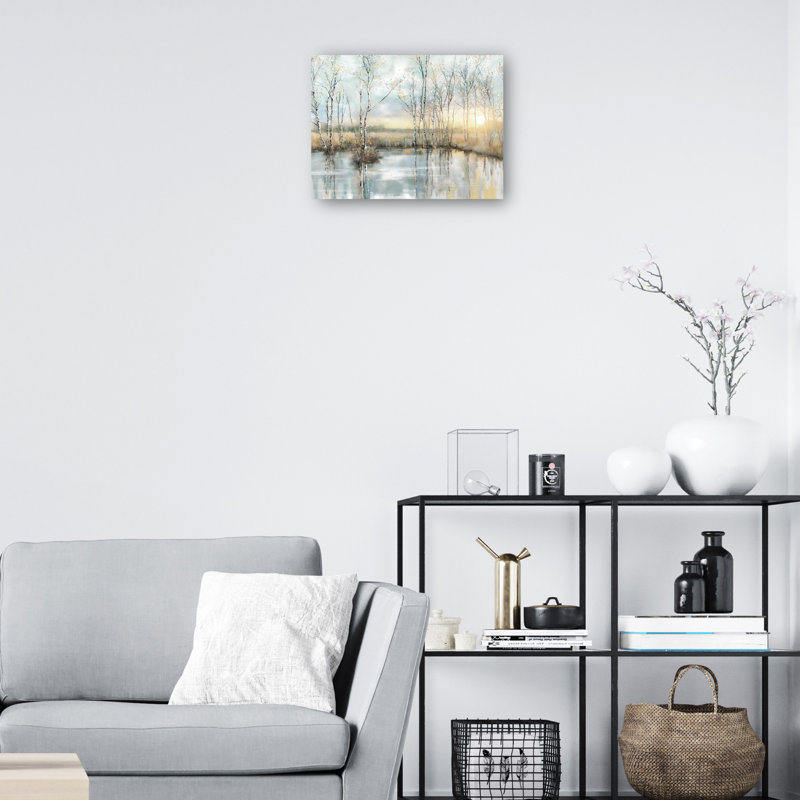Create a serene focal point in your home with Calm Reflections by Studio Arts. This tranquil canvas art print features a watercolor-inspired landscape of slender birch trees mirrored in still water, with soft hues of blue, gray, beige, and warm yellow that evoke the quiet beauty of sunrise or sunset. Expertly printed to highlight the artist’s original vision with accuracy, this nature-inspired artwork is crafted using giclee printing on premium canvas for vivid color, exceptional clarity, and enduring quality. Available in multiple sizes with an elegant champagne frame option, each piece is made-to-order and finished with a sleek, gallery-style look. Preinstalled D-rings ensure easy and secure hanging in any space.
