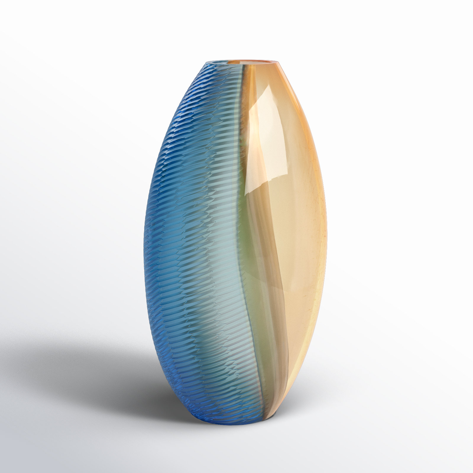 The Carthage vase is a stunning combination of amber and blue hand-blown glass, that flows together so effortlessly. It brings to mind the blue skies meeting at the horizon with the amber and gold fol…. Read More.