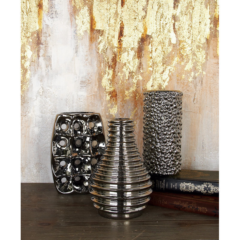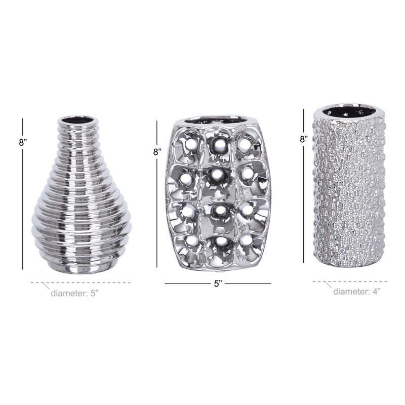 - Set of 3 vases is constructed of molded ceramic and shaped into various texture