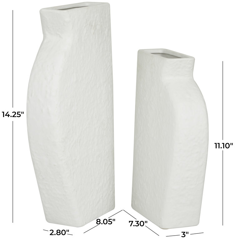 Place these abstract stoneware vases on your accent table or wooden shelving unit with dried natural foliage for an organic look. Designed with felt or rubber stoppers at the base that prevent scratching furniture and table tops, as well as sliding around. This item ships in 1 carton. Suitable for indoor use only. This item ships fully assembled in one piece. This white colored vase comes as a set of 2. Modern style. Vases have a 1.50 in, and 1.60 in mouth openings.