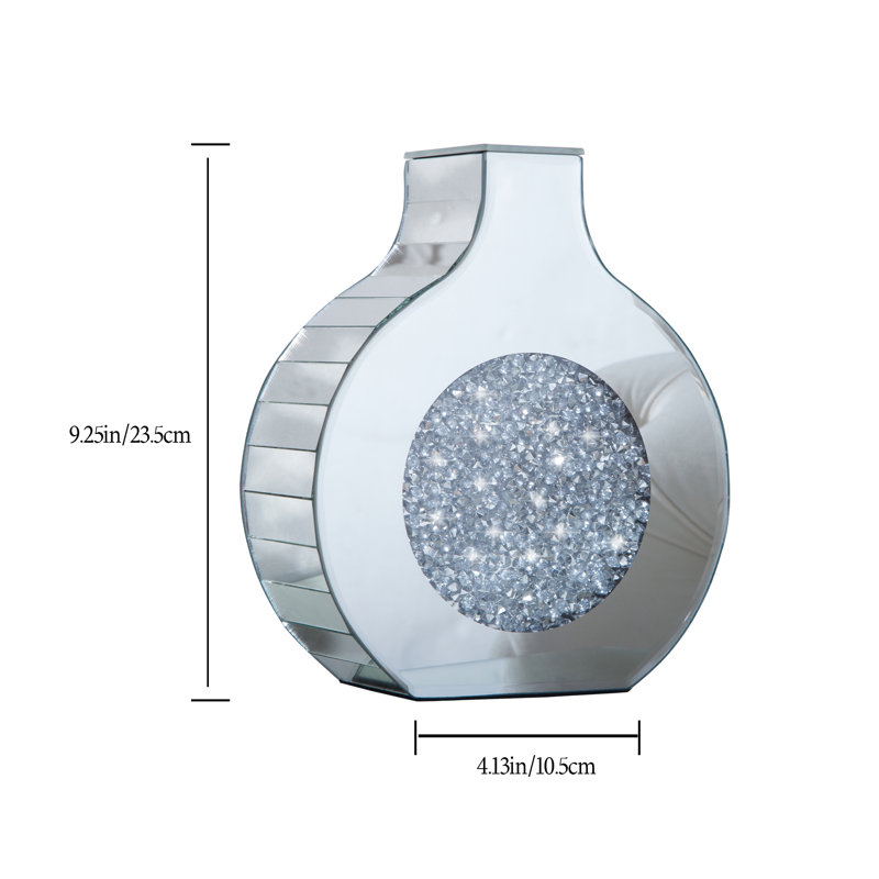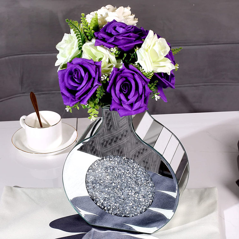 - Mirrored vase design; Crystal mirror and glass on the surface, and lots of sparkly crushed diamond crystal sparkle glaring on the front and back. Both sides feature 4mm mirrored panel glass, inside MDF construction. Thick and strong, elegant and stable. Particularly in reflecting light, the silver vase will be very bright. It can’t hold water.