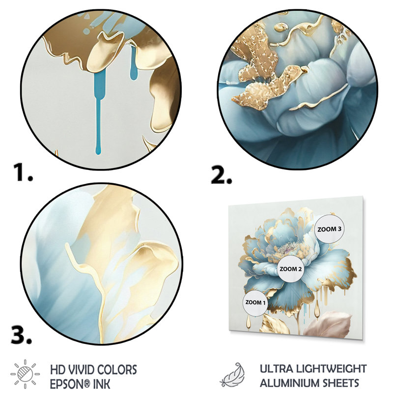 This floral wall art brings a glam vibe to your space with an artistic vibe. It’s a reproduction printed with premium inks on a square aluminum panel that adds intrigue. The design features a blooming flower with layered, pale blue petals accented with dripping gold paint. We love that this wall art comes with mounting hardware, so it’s ready to hang right out of the box. Arrange it over your sideboard, sofa, or headboard for a chic update.