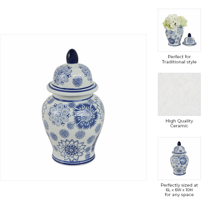Elevate your home decor with this stunning Chinoiserie-style decorative jar, crafted from high-quality stoneware and ceramic for timeless beauty and durability. Featuring intricate blue floral patterns on a classic white background, this elegant piece blends seamlessly with traditional, modern, and contemporary interiors. Measuring 6x6x10 inches, its versatile size makes it ideal for living rooms, entryways, offices, and bedrooms. Display it as a statement piece on a mantel, console table, or bookshelf, or remove the lid to create a stylish vase for fresh or faux flowers. The sturdy ceramic material ensures long-lasting use, while its exquisite craftsmanship adds an artistic touch to any space. Whether used as a decorative centerpiece or a functional accent, this lidded jar enhances your space with sophistication and charm. Bring timeless elegance into your home?order now to enjoy a beautiful blend of classic design and practicality.