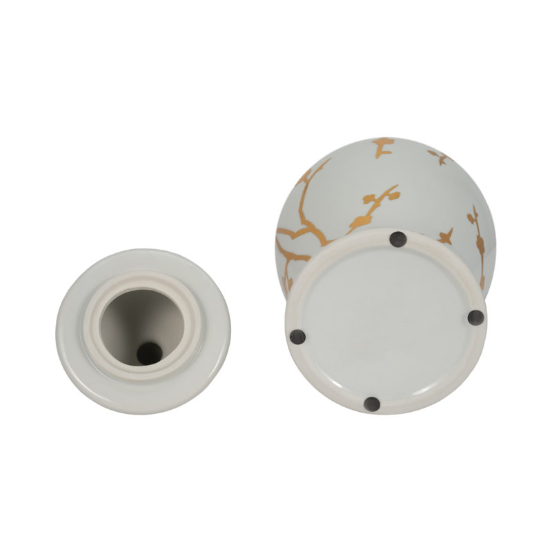 Elevate your interior style with this Chinoiserie ceramic ginger jar, a must-have for anyone seeking timeless ceramic home accents with a modern twist. Measuring 7 by 7 by 14 inches, this decorative vase is crafted from a durable white ceramic and stoneware blend and features a high-gloss finish adorned with an elegant gold cherry blossom design. Perfect for living rooms, bedrooms, offices, or entryways, this statement piece brings harmony to interiors struggling with decor cohesion or outdated trends. Its traditional silhouette and removable lid make it equally striking as a stand-alone decor item or functional flower vase. Whether your space leans classic or contemporary, this chinoiserie decor piece effortlessly bridges styles with its sophisticated shine and intricate detailing. Update your room with a look that is both elegant and versatile and add this decorative ginger jar to your cart today.