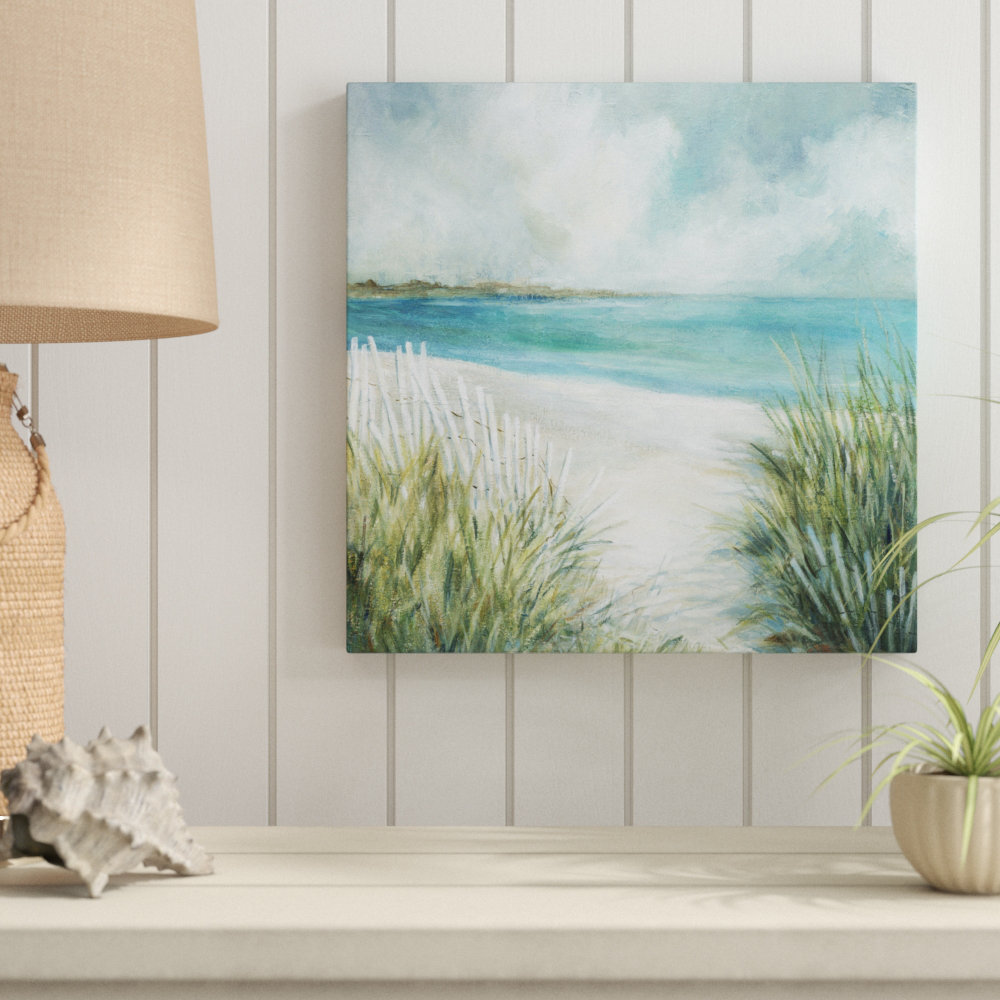 Bring a serene, beachy vibe to your bedroom, living room, or home office with this distinctive square-wrapped print. Entitled “Coastal Fences,” this reproduction of an acrylic painting is printed on wrapped canvas for a gallery-worthy look. It features a seaside landscape with lapping waves, sand, and beach grass along a wooden fence, all rendered in shades of green, blue, white, and tan, with textured embellishment. Wall mounting hardware is included, so it’s easy to hang this piece over your bed, sofa, or desk. Plus, it comes in several sizes to choose from.