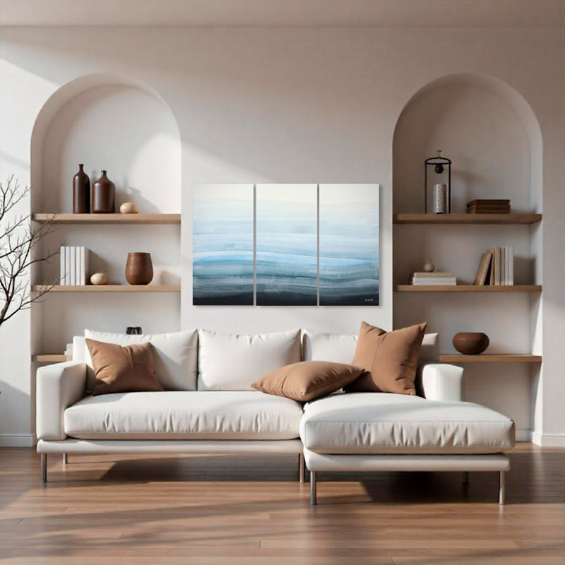 This 3-piece painting print features a triptych design that creates a calming blue colorway to display on your walls. Designed by Norman Wyatt Jr. and titled “Coastal Mist,” each canvas includes a wat…. Read More.