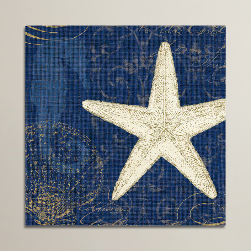 If you have a spirit for the sea, you have to show it off! Bring a bit of beach-side beauty right into your own abode with this eye-catching canvas print. Showcasing a bold starfish against a background splashed with shells and scrolling details alike, it offers neutral tones of blue and beige. Made in the USA, this pleasant piece is printed on canvas and wrapped around a wood frame for a look that rivals any boardwalk gallery. Just set this stunner above a wood console table for an artful display that evokes the elegance of the ocean, even more, alluring with a traditional glass lantern hanging overhead.