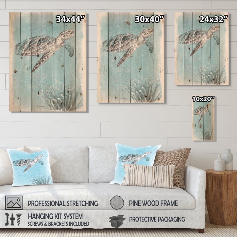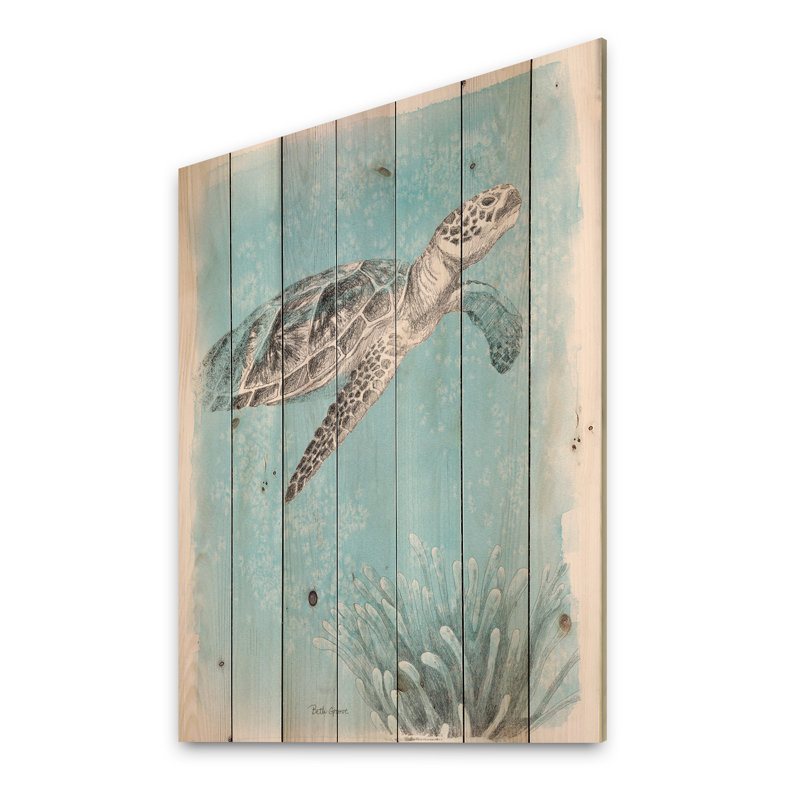 Coastal Sea Life I Turtle Sketches Print on Natural Wood