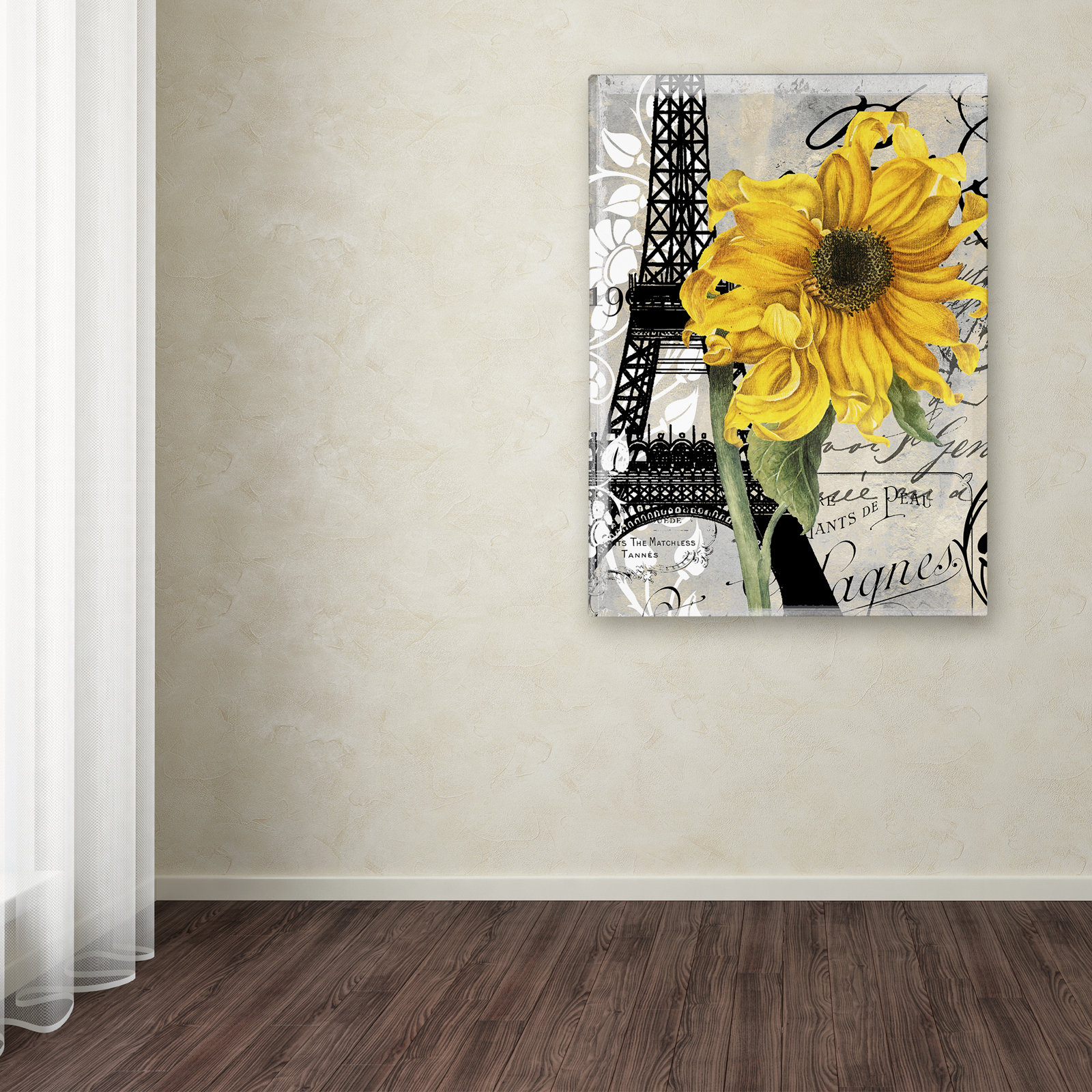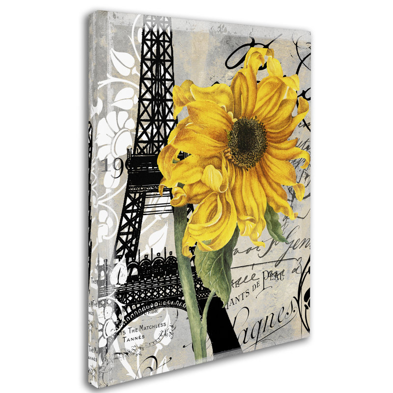This ready to hang and gallery wrapped art piece features a yellow sunflower against a collage of French writing, the Eiffel Tower, and floral designs. Giclee (jee clay) is an advanced printmaking pro…. Read More.