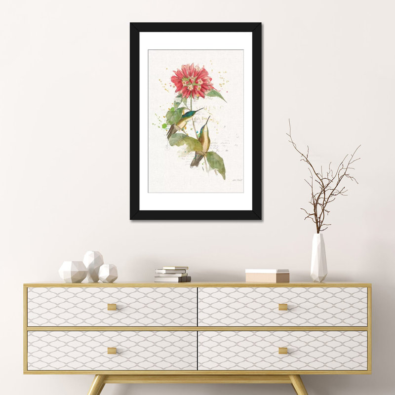 Antique inspiration and natural style meet in this lovely graphic art print, showcasing a pair of hummingbirds perched atop a blooming flower. Subtle textual overlay gives this print a bit of classic character, while red, green, and beige hues dot the design for a subdued splash of color. Proudly made in the USA, this piece is printed on an artist-grade cotton canvas and stretched over pinewood bars for a gallery-wrapped look. Wall-mounting hardware is included to ensure the hanging process is a breeze.